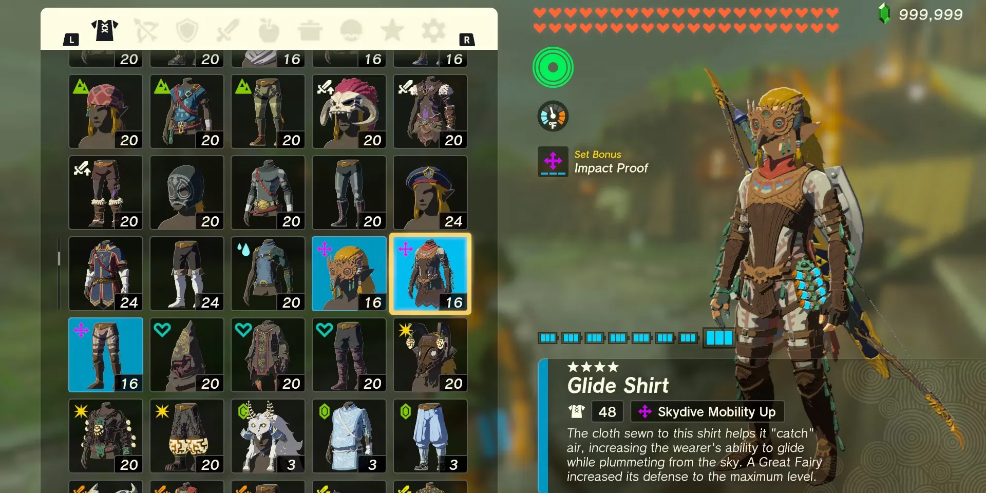 В игре The Legend of Zelda: Tears of the Kingdom представлены различные комплекты доспехов, которые дают Линку различные преимущества. Комплект брони Glide Armor, также известный как "Wingsuit", особенно полезен, поскольку он дает Линку бонус Skydive Mobility Up. Этот бонус позволяет Линку скользить на параплане на большие расстояния, резко сокращая расход выносливости. Благодаря этому путешествовать между многочисленными Небесными островами Хайрула можно с легкостью (в буквальном смысле).