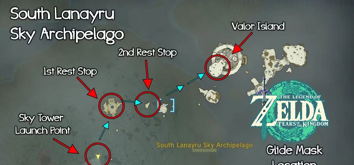 После запуска в небо летите на северо-восток от башни в сторону острова Валор, расположенного в регионе Южный архипелаг Ланайру Скай. Имейте в виду, что попытка полететь прямо к острову Валор потребует значительного количества выносливости по сравнению с предыдущими островами. Сделайте остановку на соседних островах к северо-востоку от башни. На каждом из этих островов есть собранный летательный аппарат Зонаи, который поможет добраться до следующего острова.