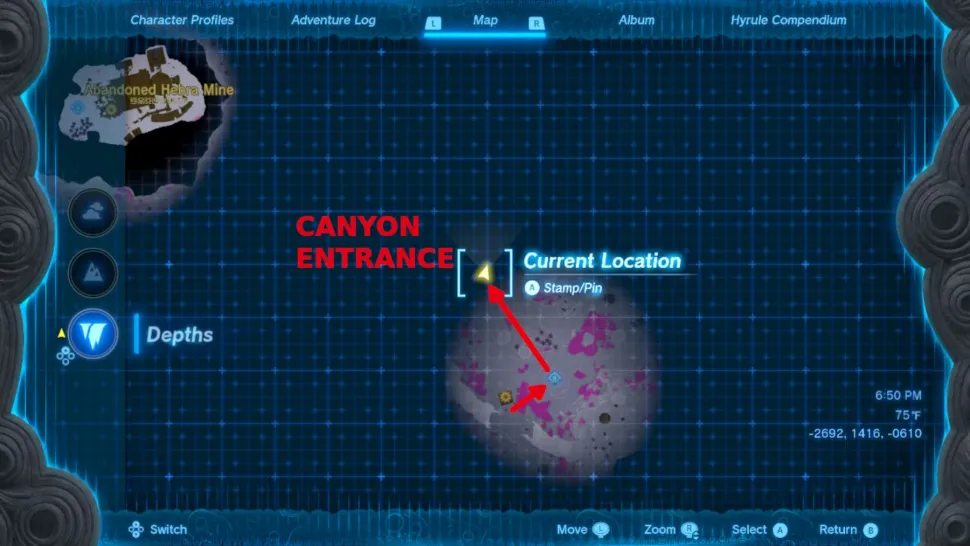 - Идите на северо-запад к входу в каньон по координатам -2692, 1416, -0610.
