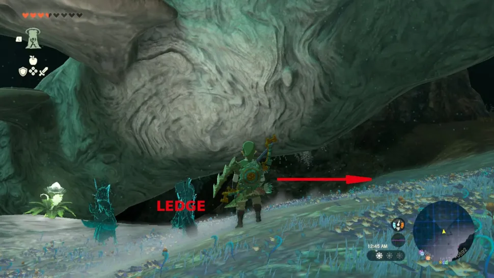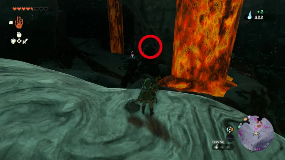 - Экипируйте броню TotK "Flamebreaker" и идите по корню вверх к лавовому водопаду.