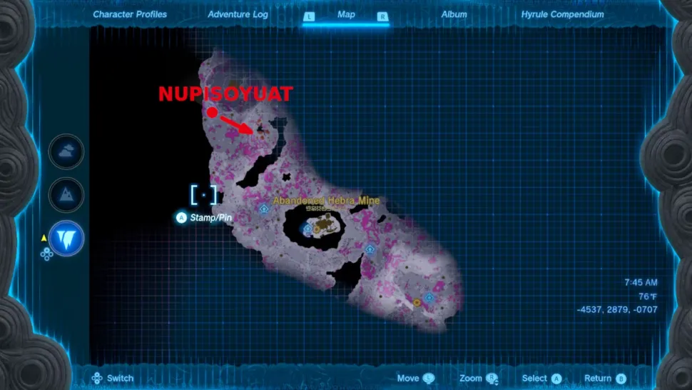 - Идите на север к световому корню Нуписоюат по адресу -4537, 2879, -0707, пройдя по пути мимо сине-белого фрокса.
