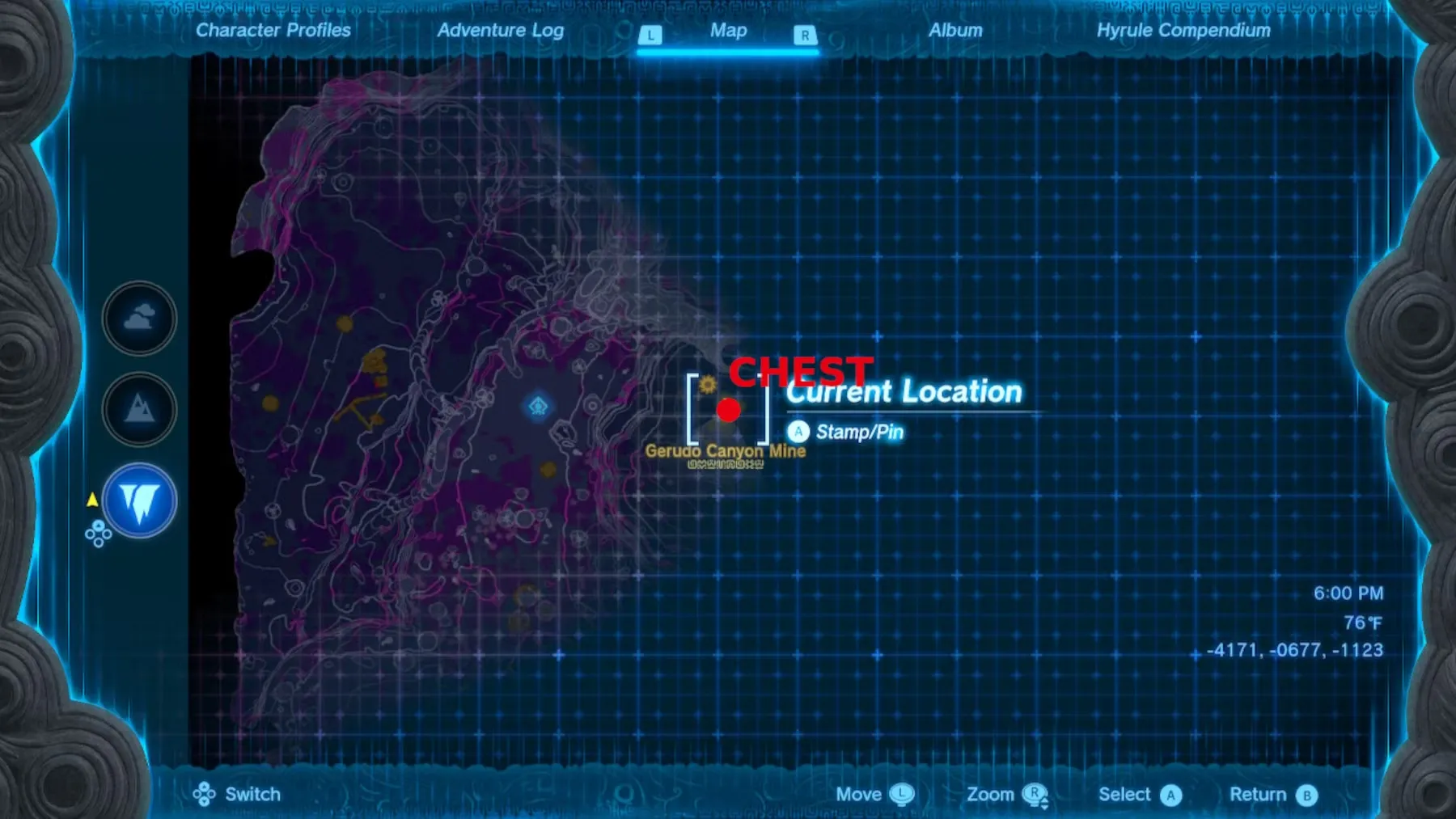 Брюки времени находятся в сундуке по координатам -4180, -0697, -1121 в шахте Gerudo Canyon в Глубинах. Это самый простой предмет из набора "Доспехи времени", и этот маршрут приведет игроков прямо к нему: