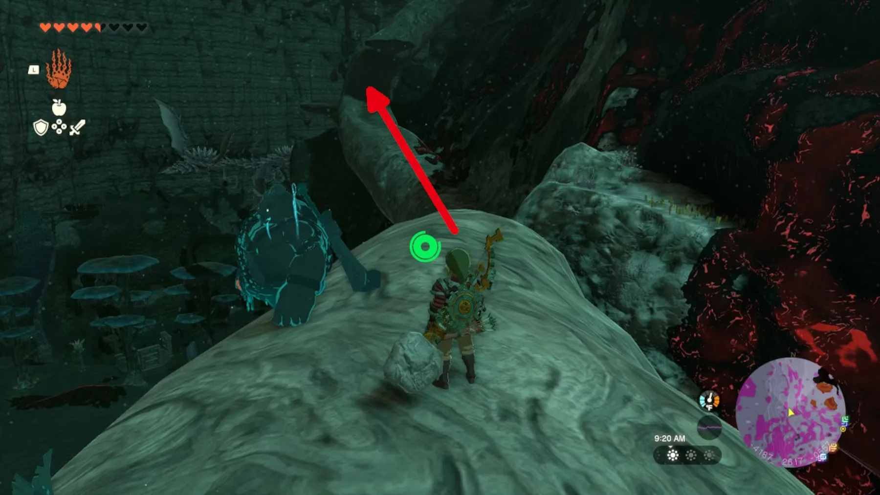 - Экипируйте броню TotK "Flamebreaker" и идите по корню вверх к лавовому водопаду.