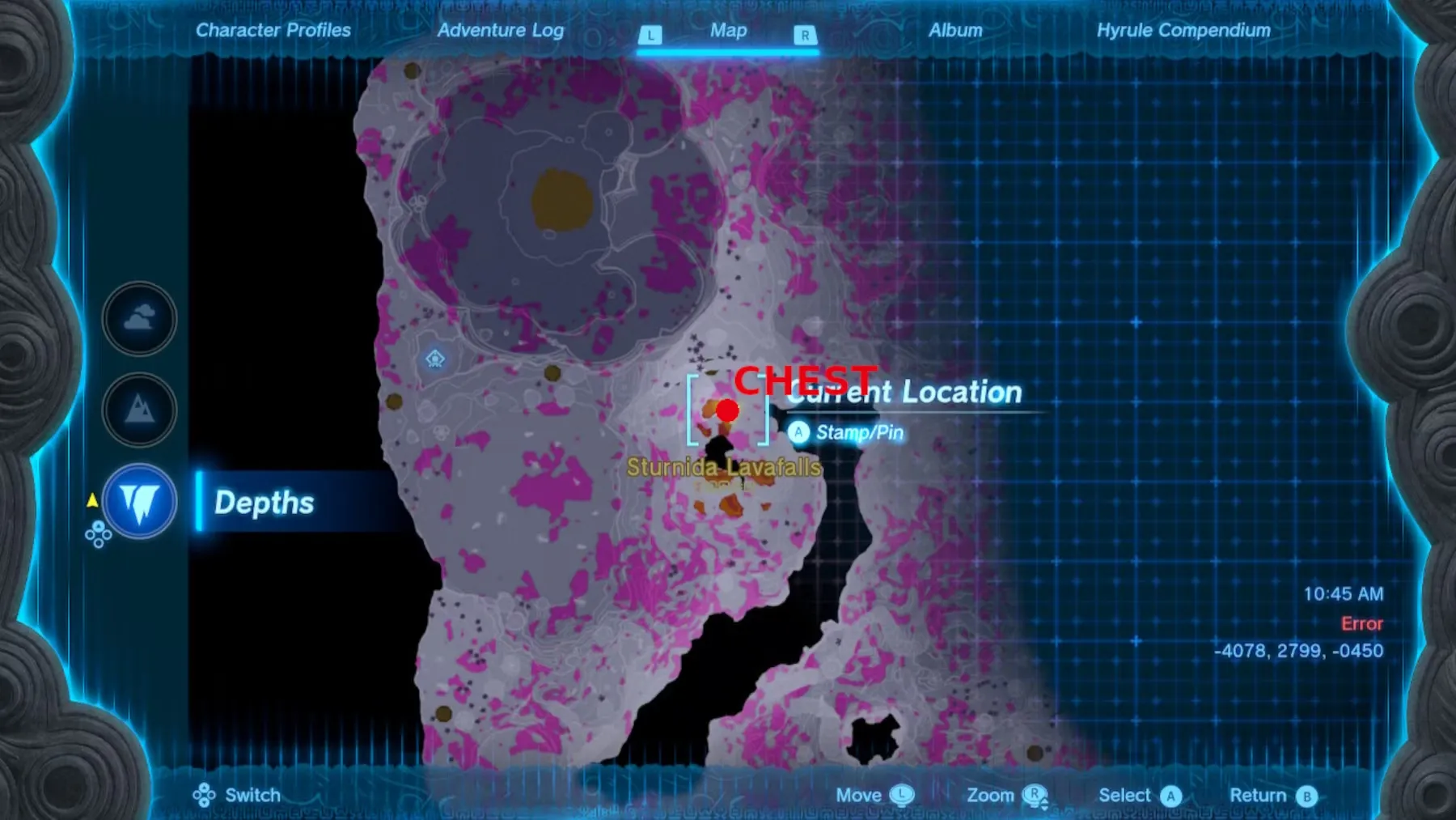 - Сундук находится на каменном столбе по координатам -4078, -2799, -0450, рядом с лавовым обвалом.