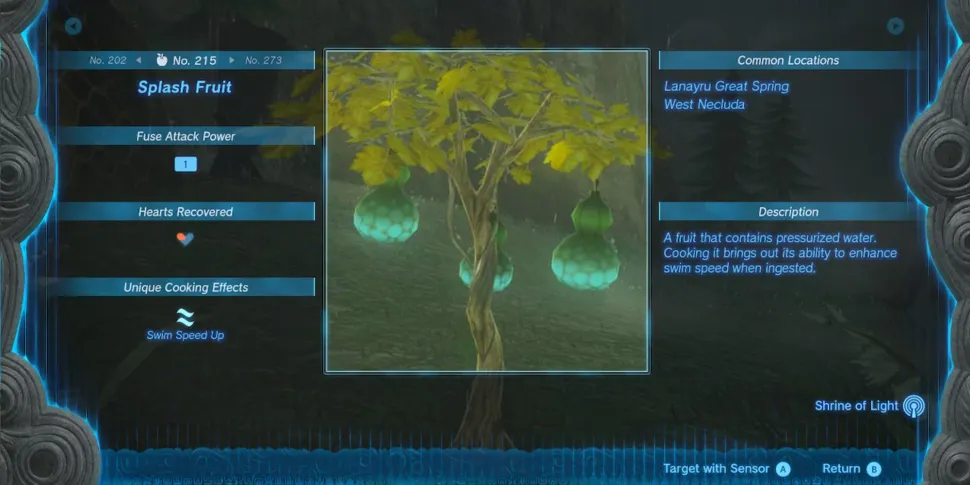Splash Fruit также можно использовать в рецептах, обеспечивая Линку повышенную скорость плавания - тот же эффект, что и у набора брони Зора. Игроки смогут получить полный комплект только после завершения основного задания "Сидон Зора", так что это простой и эффективный способ воспроизвести эффект. Отправляясь в Храм Воды или выполняя побочные задания в окрестностях Домена Зора, Линк будет много плавать.