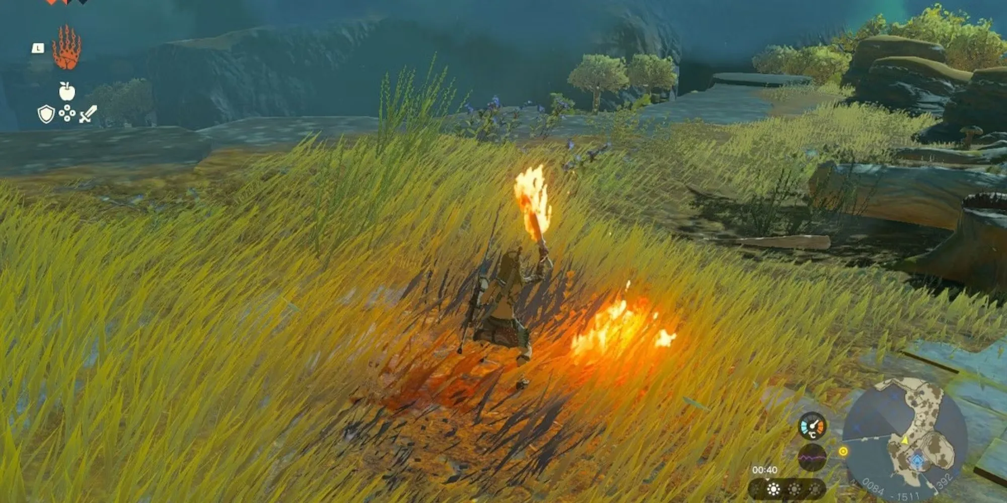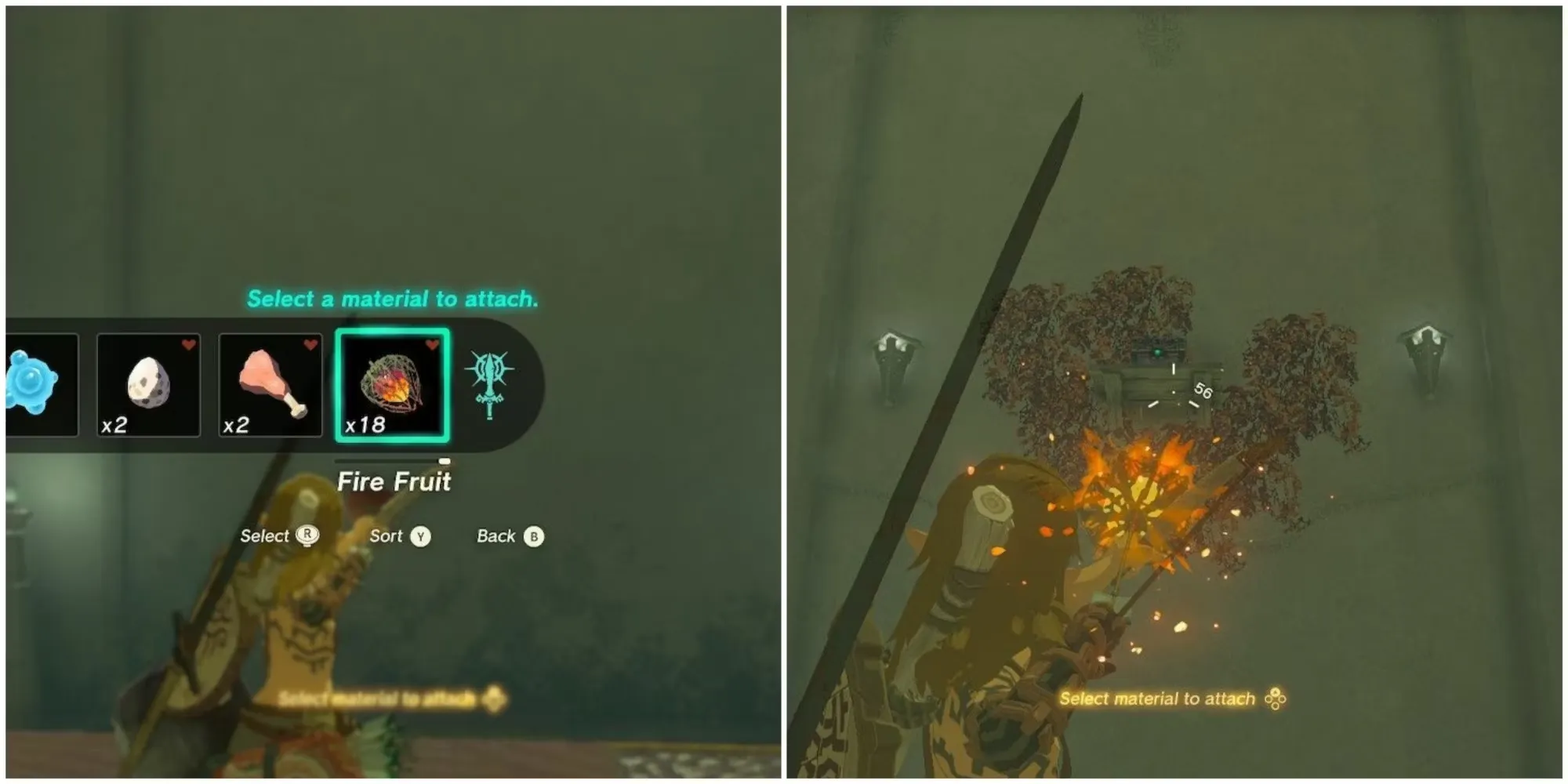 Также можно использовать Огненный плод, чтобы создать огонь. Если игрок нажмет R на своем контроллере, Линк сможет бросить любое оружие или материал. Он может держать огненный плод, а затем бросить его, чтобы разжечь огонь в определенной области. Кроме того, геймеры могут соединить Огненный плод с оружием или стрелой и использовать его на листве - при попадании он вызовет пожар.