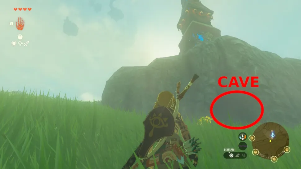 Первый шаг к разблокированию башни Sahasra Slope Skyview Tower - забраться под нее, а сделать это можно, войдя в пещеру Sahasra Slope Cave по координатам 1326, -1156, 0138. Для полной ясности эти координаты находятся в нижней части скалы, на которой стоит башня Sahasra Slope Skyview Tower, а следующее изображение должно помочь игрокам Zelda найти вход.