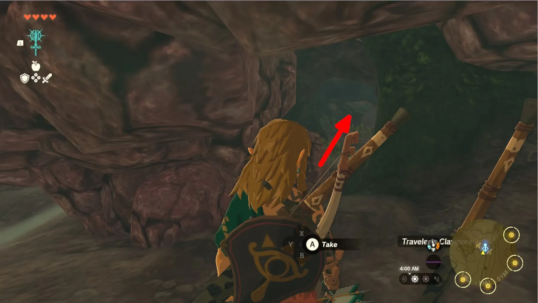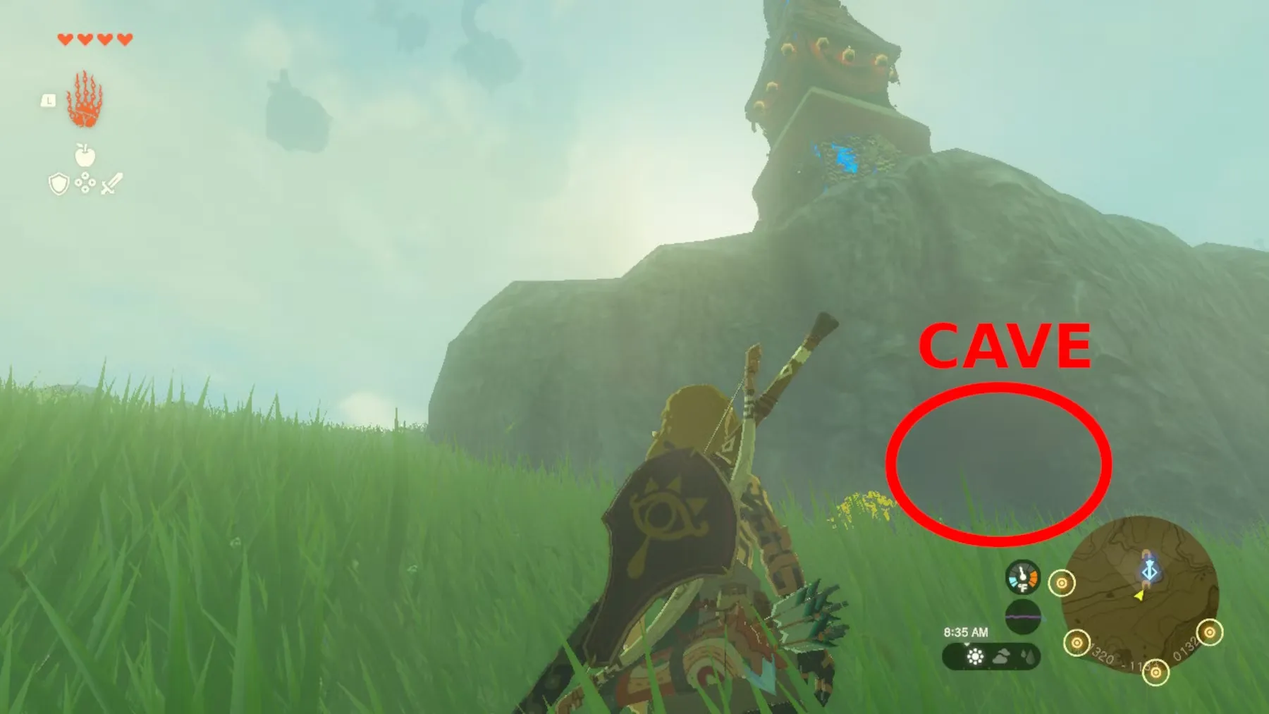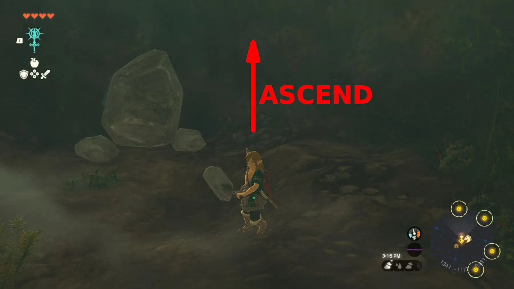 Добравшись до пещеры, игроки должны использовать оружие, сросшееся с камнем, чтобы быстро разбить расколотые валуны внутри, остановившись, когда они достигнут 1354, -1162, 0134. Затем игроки должны направить Линка на юг и начать разбивать валуны впереди, чтобы получить доступ к небольшому алькову. Находясь в этой нише, игроки, ориентирующиеся по мини-карте, обнаружат, что они находятся прямо под башней Sahasra Slope Skyview Tower, и смогут использовать способность TotK's Ascend, чтобы пройти сквозь стены и войти в строение.