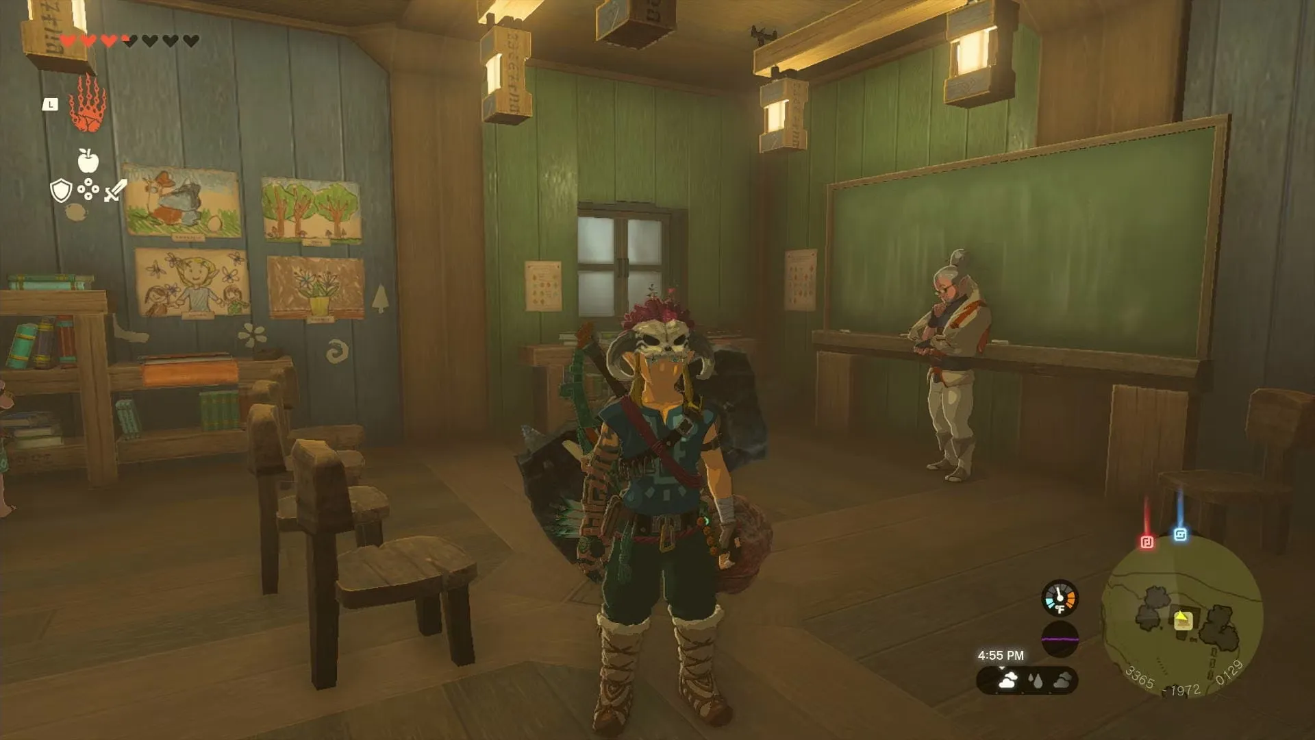 Прибыв в деревню Хатено, игрок должен следовать по подробным деревянным указателям, которые ведут к деревенской школе, расположенной на крайнем северо-западе деревни по координатам 3365, -1984, 0129. Здесь Линк воссоединяется с учителем Симином, который ранее, в Breath of the Wild, работал в лаборатории древних технологий деревни. Теперь перед ним стоит новая задача: убедить своих скептически настроенных юных учеников в возникновении Катастрофы и других исторических событий.