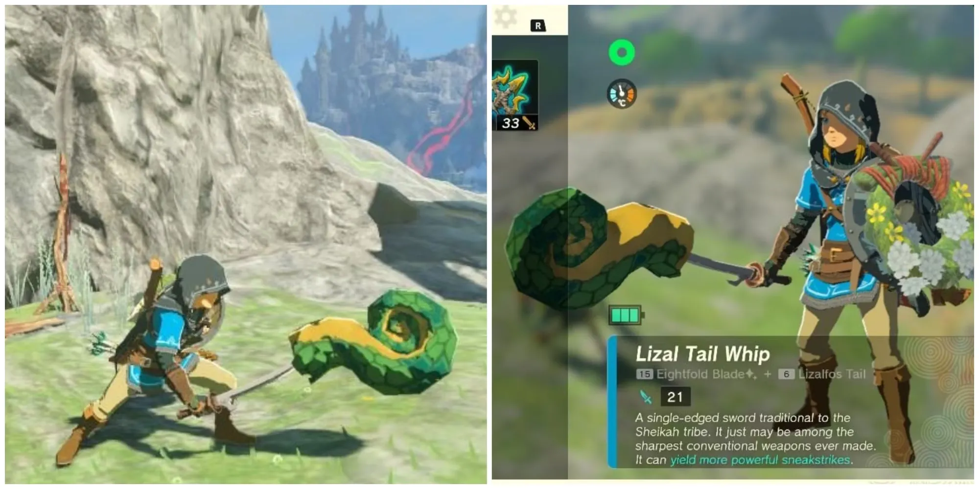 Чтобы создать кнут в Tears of the Kingdom, геймеры могут соединить хвост Лизальфоса с оружием в инвентаре. Этот трюк особенно хорошо работает с копьями, и они являются отличной комбинацией для ранней игры, так как позволяют игроку держать дополнительную дистанцию от противника, что затрудняет попадание.