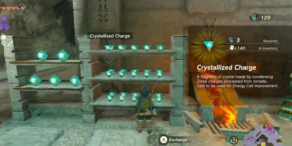 - Перерабатывайте Кристаллизованные заряды: Кристаллизованные заряды - это особый ресурс, который понадобится Линку для модернизации Энергетической ячейки. Он встретит специальных конструктов, которые переработают три зонита в один кристаллизованный заряд. По мере прохождения игры будет появляться все больше возможностей получить кристаллизованные заряды, но в ранних частях лучшим вариантом будет кузнечный конструктор.