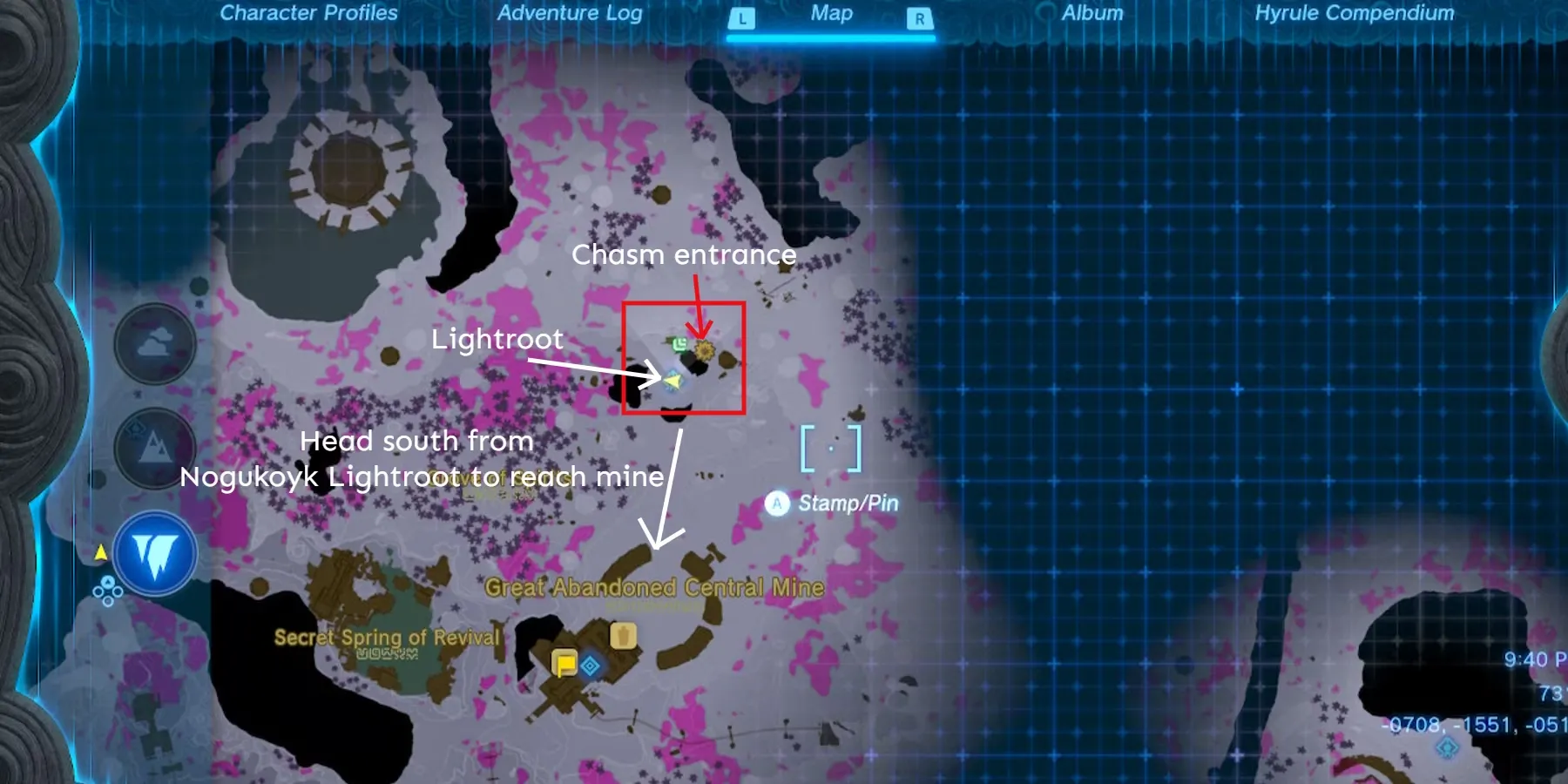 Линк может легко найти Великую заброшенную шахту, войдя в Глубины из Северной пропасти Великого плато (-0661, -1520, 0667). Как только Линк окажется на дне, отправляйтесь на юго-запад, чтобы найти Световой корень Ногукойка (-0708, -1551, -0517). От Лайтрута прямо к югу находится шахтная структура.