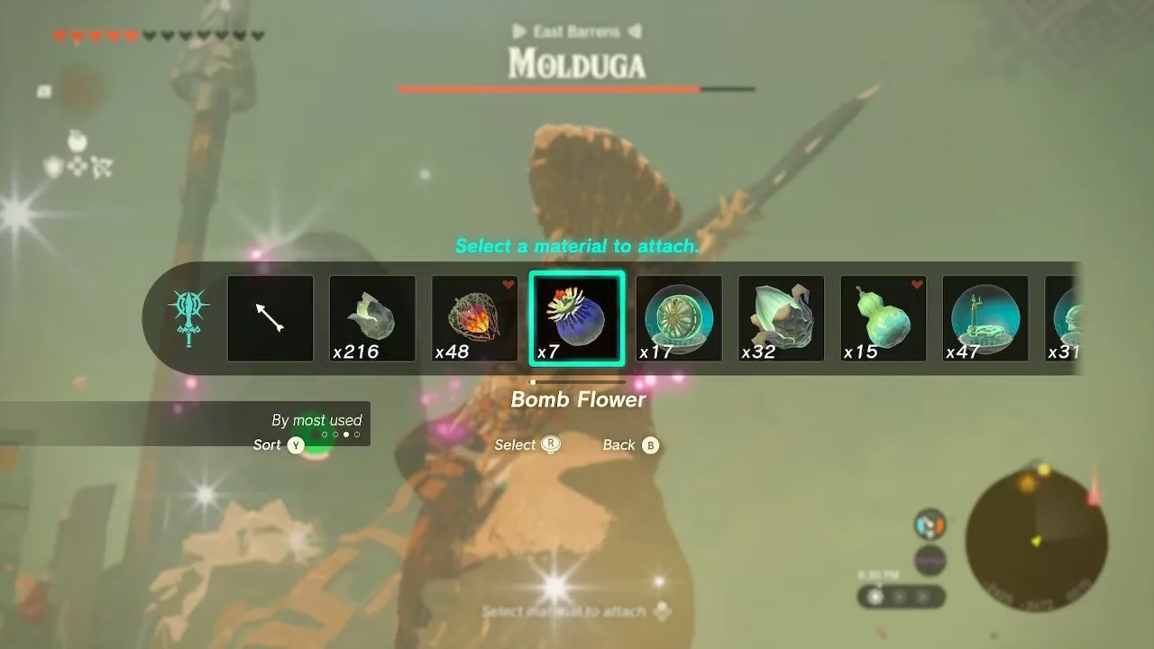 Игроки также могут использовать Bomb Flowers, прикрепленные к стрелам, чтобы добиться того же эффекта, но для того, чтобы молдуга была обезврежена, она должна попасть в него, когда он выпрыгнет из земли.