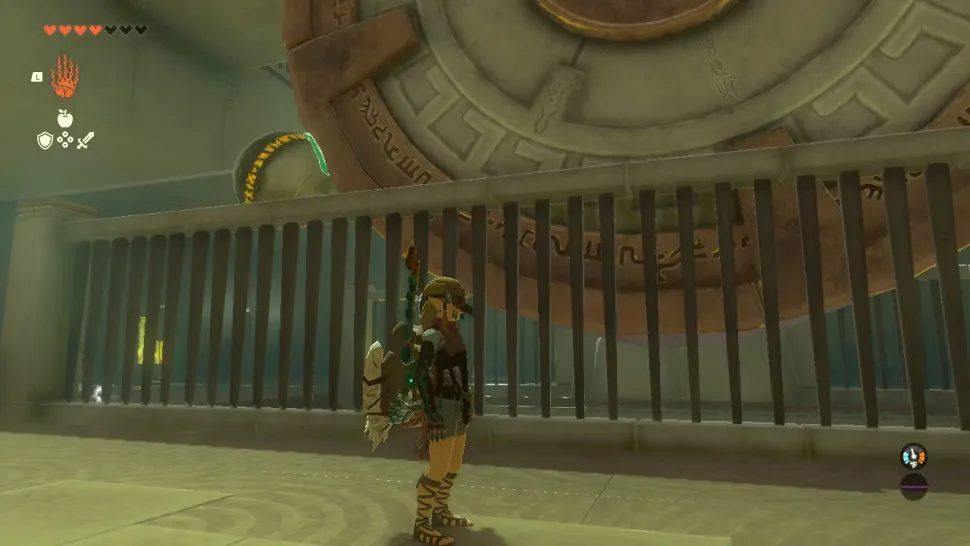 Наконец, игроки могут прикрепить шарик к колесу и заставить его вращаться до самого верха. Это приведет мяч на рампу, которая ведет к отверстию, в которое должен попасть шар, чтобы дверь святилища открылась. Игроки должны воспользоваться расположенной рядом лестницей, чтобы подняться обратно, а затем с помощью Ультраруки схватить шар и задвинуть его в отверстие. После этого дверь в конце святилища откроется, и игроки получат доступ к своей награде.