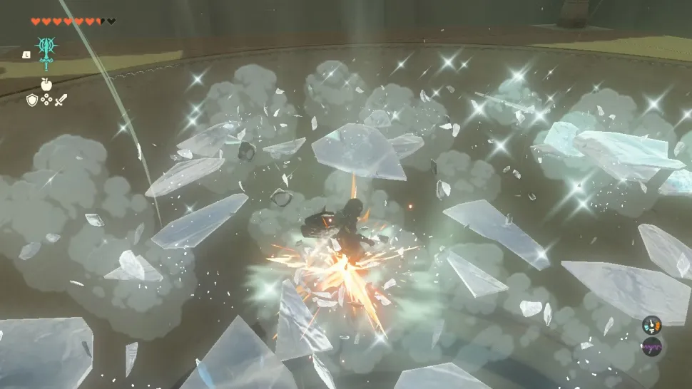 Внизу Линк приземлится на замороженную платформу. Прыгните на нее несколько раз, чтобы разбить ее и упасть в еще более низкую комнату с сильными вертикальными порывами ветра, которые подтолкнут Линка обратно вверх.