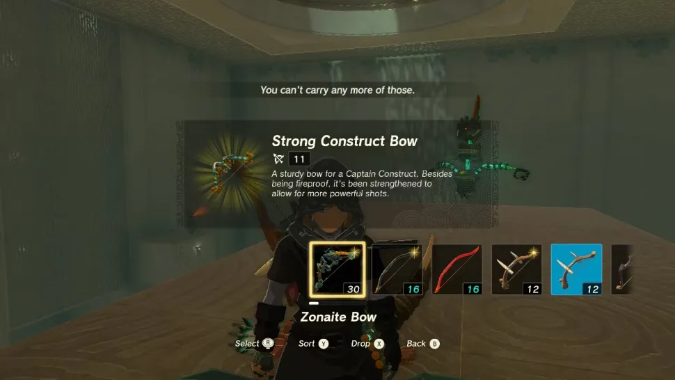Как только Линк опустится в эту комнату, достаньте параплан, а затем просто скользните к этой платформе, чтобы открыть сундук. Внутри находится Лук сильной конструкции с базовым уроном 11.