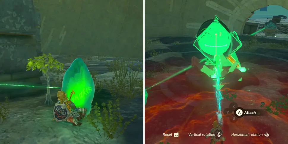 Оказавшись внутри сферы, игроки должны обратить внимание на миниатюрную парящую сферу в центре области, а затем использовать способность Линка "Ультрарука", чтобы повернуть ее так, чтобы отверстие в сфере было обращено к Zonai Device Dispenser. Хороший способ сделать это - поместить зеленый кристалл за миниатюрной сферой, а затем использовать луч света в качестве ориентира.