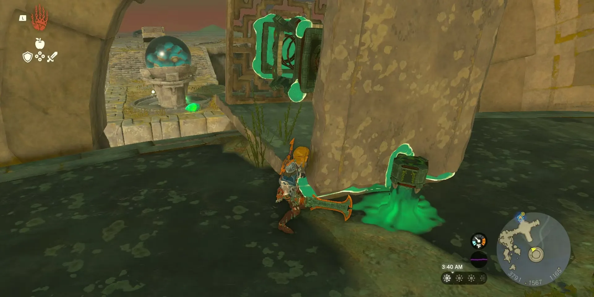 Оказавшись внутри сферы, игроки должны обратить внимание на миниатюрную парящую сферу в центре области, а затем использовать способность Линка "Ультрарука", чтобы повернуть ее так, чтобы отверстие в сфере было обращено к Zonai Device Dispenser. Хороший способ сделать это - поместить зеленый кристалл за миниатюрной сферой, а затем использовать луч света в качестве ориентира.