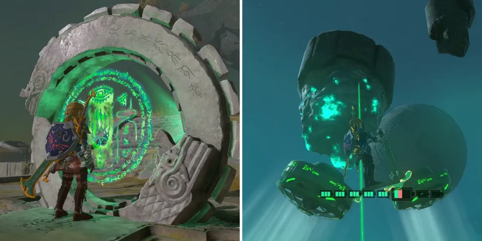 Какой бы способ они ни выбрали, оказавшись на острове с зеленым кристаллом, игроки должны поднять кристалл с помощью способности Link's Ultrahand, а затем сбросить его с края неподалеку, внимательно следя за тем, чтобы все было выстроено так, чтобы кристалл приземлился на остров внизу под ними. В этом им может помочь зеленый луч света или просто поверните камеру, чтобы лучше видеть. Если они промахнутся, ничего страшного не случится: кристалл просто возродится рядом с ними, если не приземлится на остров внизу.