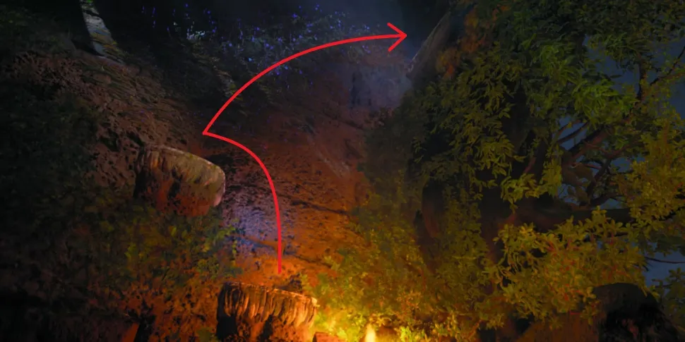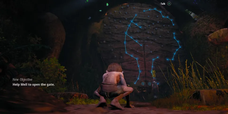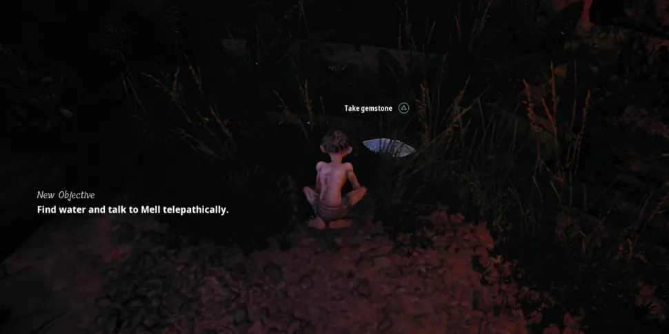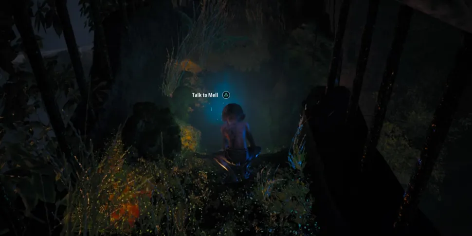 Слепой эльф Мелл скажет Голлуму, что нужно найти немного воды, чтобы они могли общаться телепатически. Чтобы найти воду, Голлум должен повернуть направо и использовать два выступающих камня на стене, чтобы добраться до лиан над головой. Забравшись по этим лианам направо, он может спуститься на небольшую дорожку, где можно найти воду и пообщаться с ней.