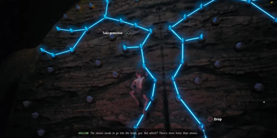Спустившись обратно на землю, Голлум может собрать два драгоценных камня перед дверью и взаимодействовать со свечой справа, чтобы погасить ее. После этого он должен забраться на Врата Мрака и поместить драгоценные камни в нужные слоты.