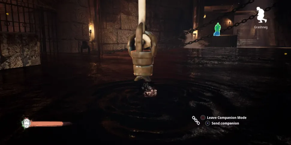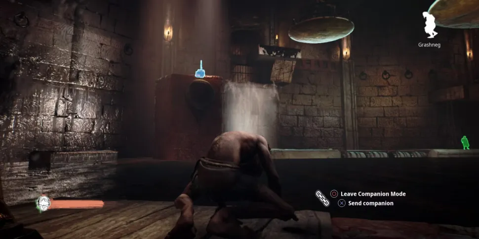 Повернувшись лицом к лестнице, игроки должны снова войти в режим компаньона, чтобы приказать Грашнегу потянуть за рычаг наверху; тогда вода поднимется в третий раз.