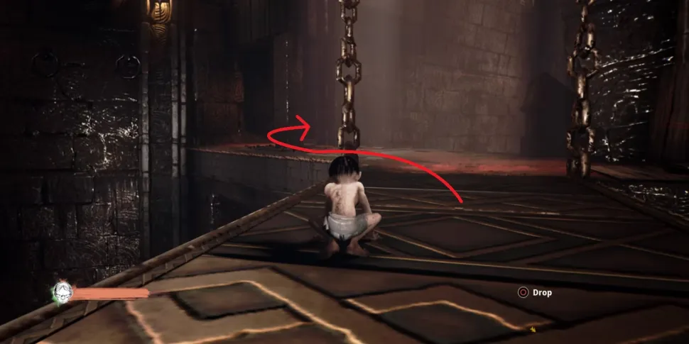 Спустившись по лестнице на нижнюю платформу и повернув налево, Голлум должен прыгнуть в воду внизу, переплыть на другую сторону и взобраться на квадратную платформу с лестницей. На вершине этой лестницы ему нужно будет пробежать по стене справа, чтобы добраться до рычага на платформе впереди. Потянув за этот рычаг, вы поднимете уровень воды, что также создаст мост, по которому Грашнег сможет продвинуться дальше в канализацию.
