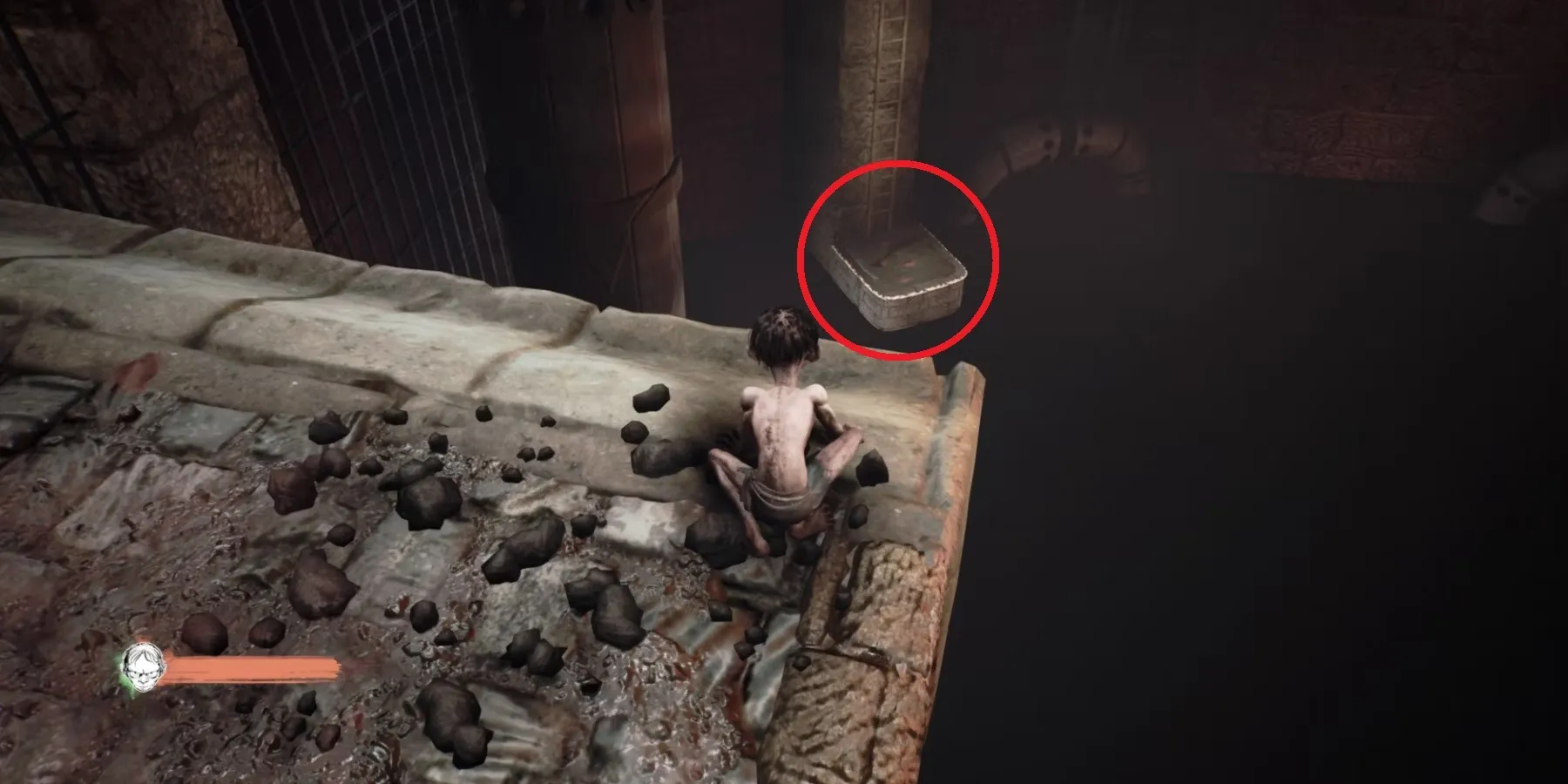 Спустившись по лестнице на нижнюю платформу и повернув налево, Голлум должен прыгнуть в воду внизу, переплыть на другую сторону и взобраться на квадратную платформу с лестницей. На вершине этой лестницы ему нужно будет пробежать по стене справа, чтобы добраться до рычага на платформе впереди. Потянув за этот рычаг, вы поднимете уровень воды, что также создаст мост, по которому Грашнег сможет продвинуться дальше в канализацию.