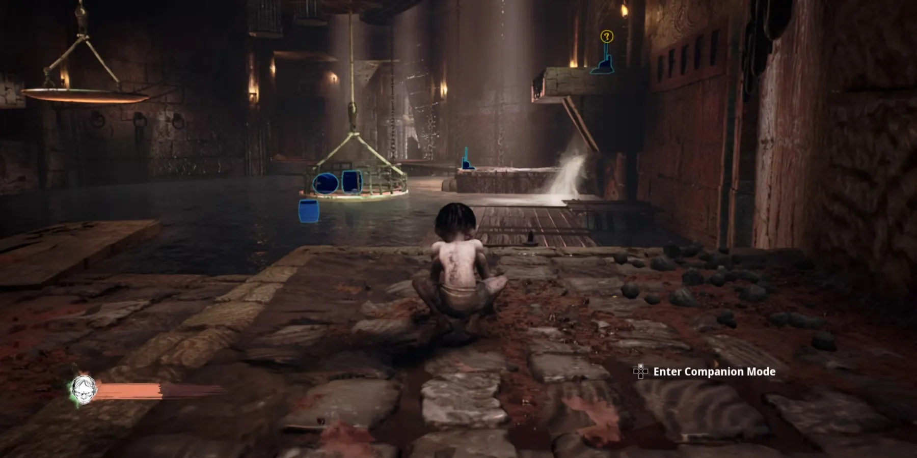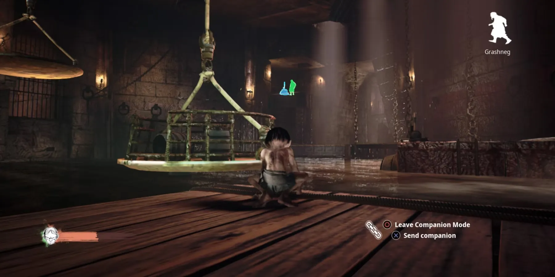 Чтобы снова поднять уровень воды, игроки должны развернуть Голлума и войти в режим компаньона, чтобы приказать Грашнегу пройти по мосту, подняться по лестнице и потянуть за следующий рычаг.