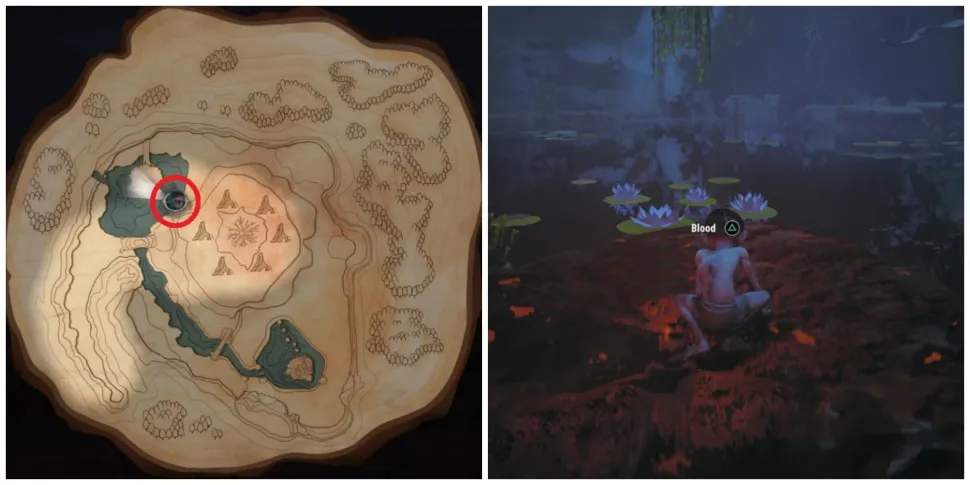 Двигаясь на северо-запад от дерева, Голлум достигнет небольшого озера, где он сможет найти и взаимодействовать с Кровью на земле. Прыгнув в озеро и нырнув на дно, он найдет рукоять клинка.