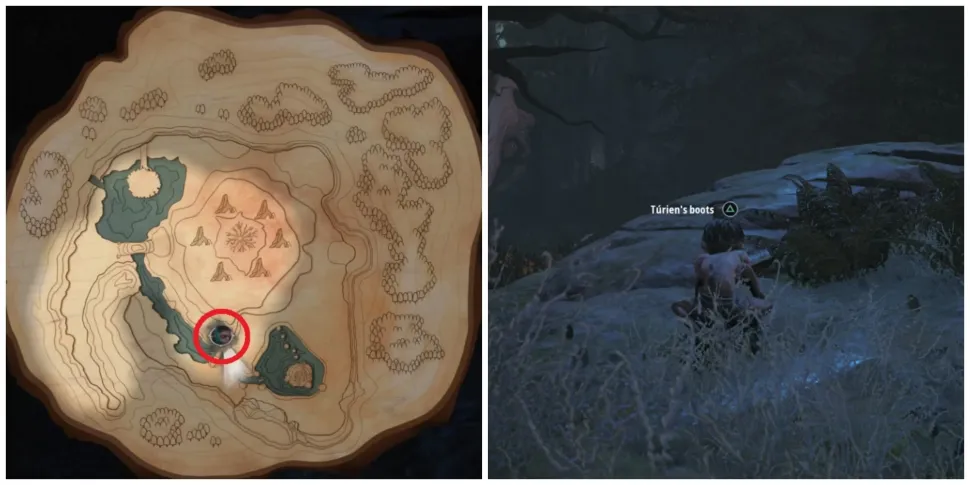 Двигаясь на юг от юго-западного Ритуального камня, Голлум найдет пару сапог Турьена рядом с началом небольшого каменного моста.
