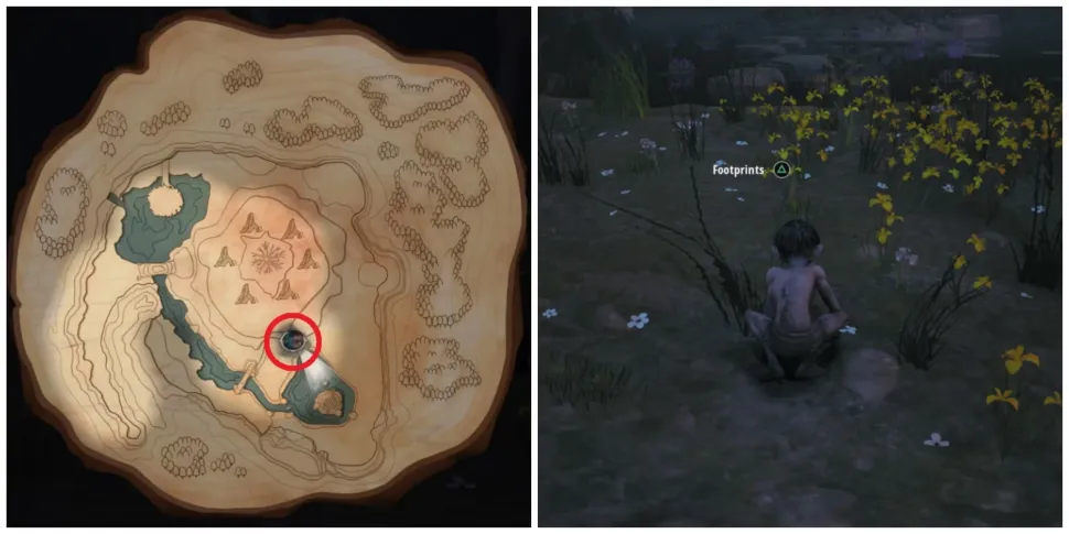 Если повернуть на восток и направиться к озеру чуть меньшего размера, подсказку "Следы" можно найти рядом с желтыми цветами у кромки воды.