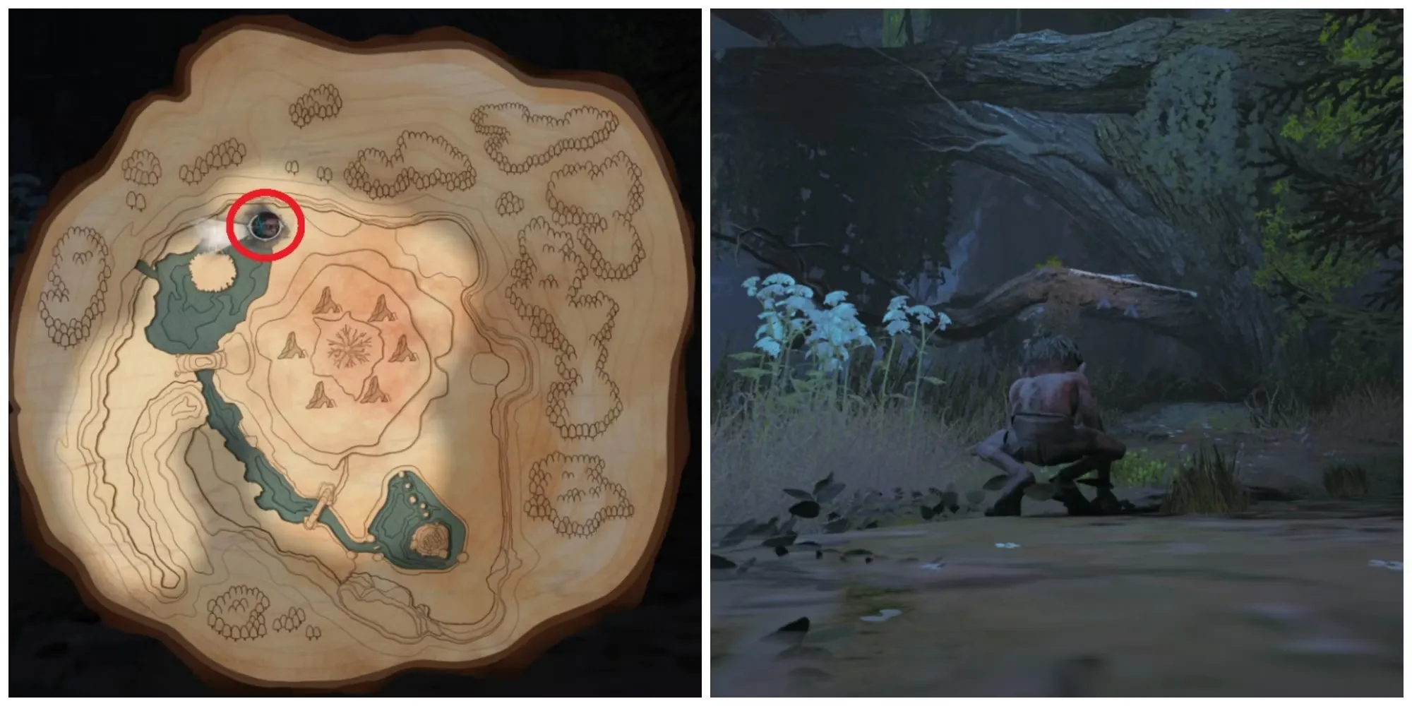 Двигаясь на северо-запад от дерева, Голлум достигнет небольшого озера, где он сможет найти и взаимодействовать с Кровью на земле. Прыгнув в озеро и нырнув на дно, он найдет рукоять клинка.