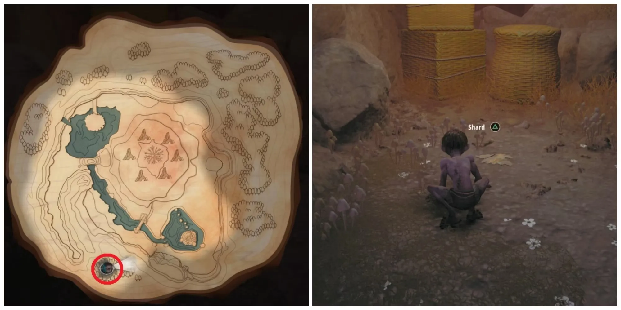 Прямо к югу отсюда Голлум пройдет между двумя большими деревьями и найдет скрытую область. Следуя по тропинке вперед, он дойдет до тупика, где на земле можно найти коллекционный предмет "Осколок".