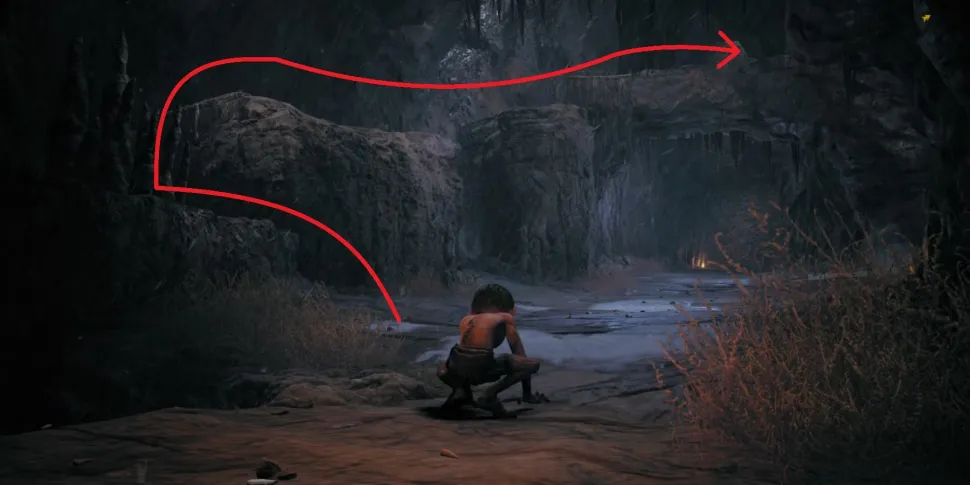 Следуя по тропинке до конца этой комнаты, вы попадете в следующую часть истории; прежде чем идти туда, игроки должны обратить внимание на выступающие каменные платформы слева. Запрыгнув на первую платформу, Голлум может повернуть направо и забраться на ту, что находится выше, где ему нужно перепрыгнуть на чуть более высокую платформу, чтобы попасть на узкий каменный проход.