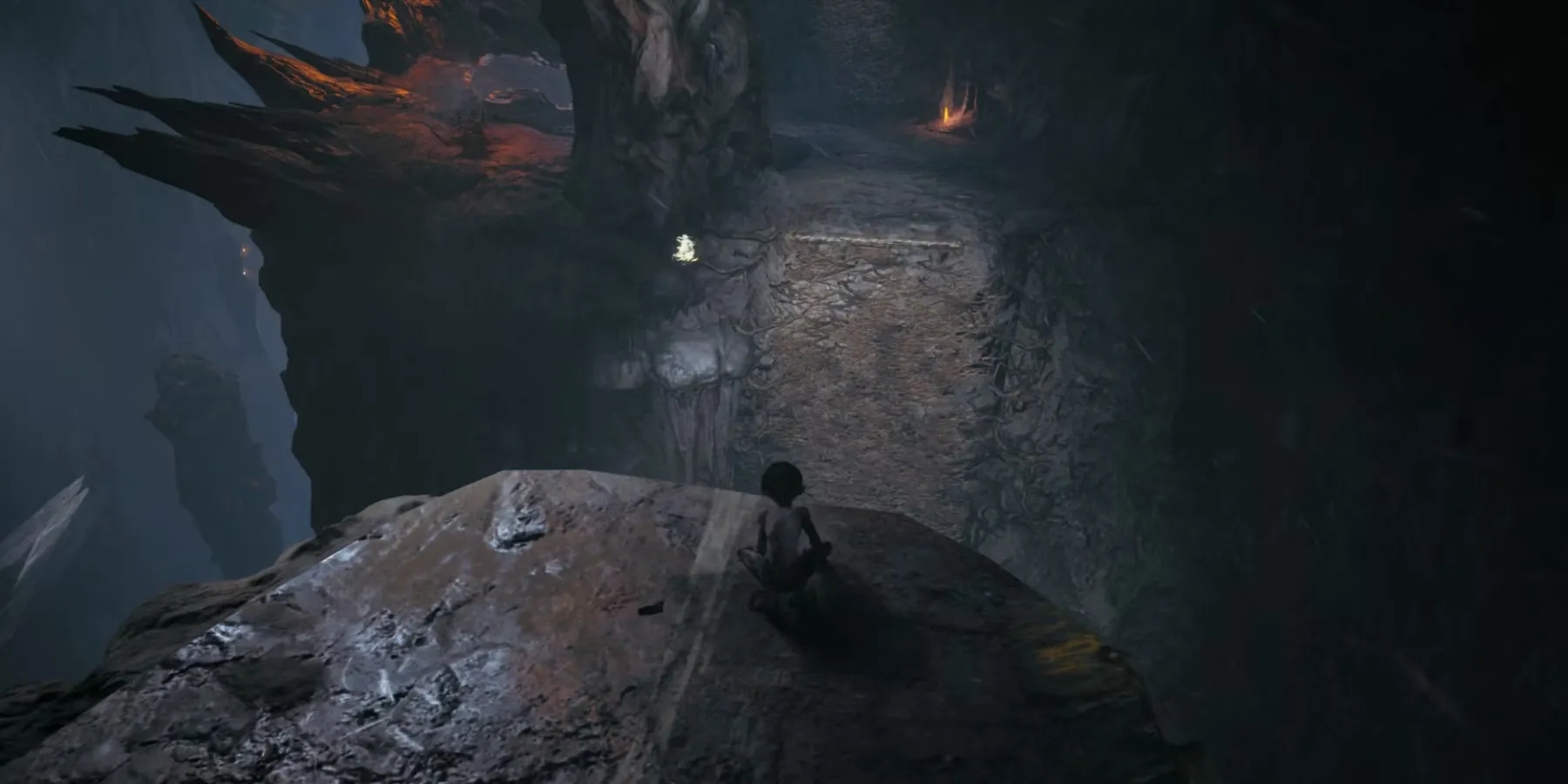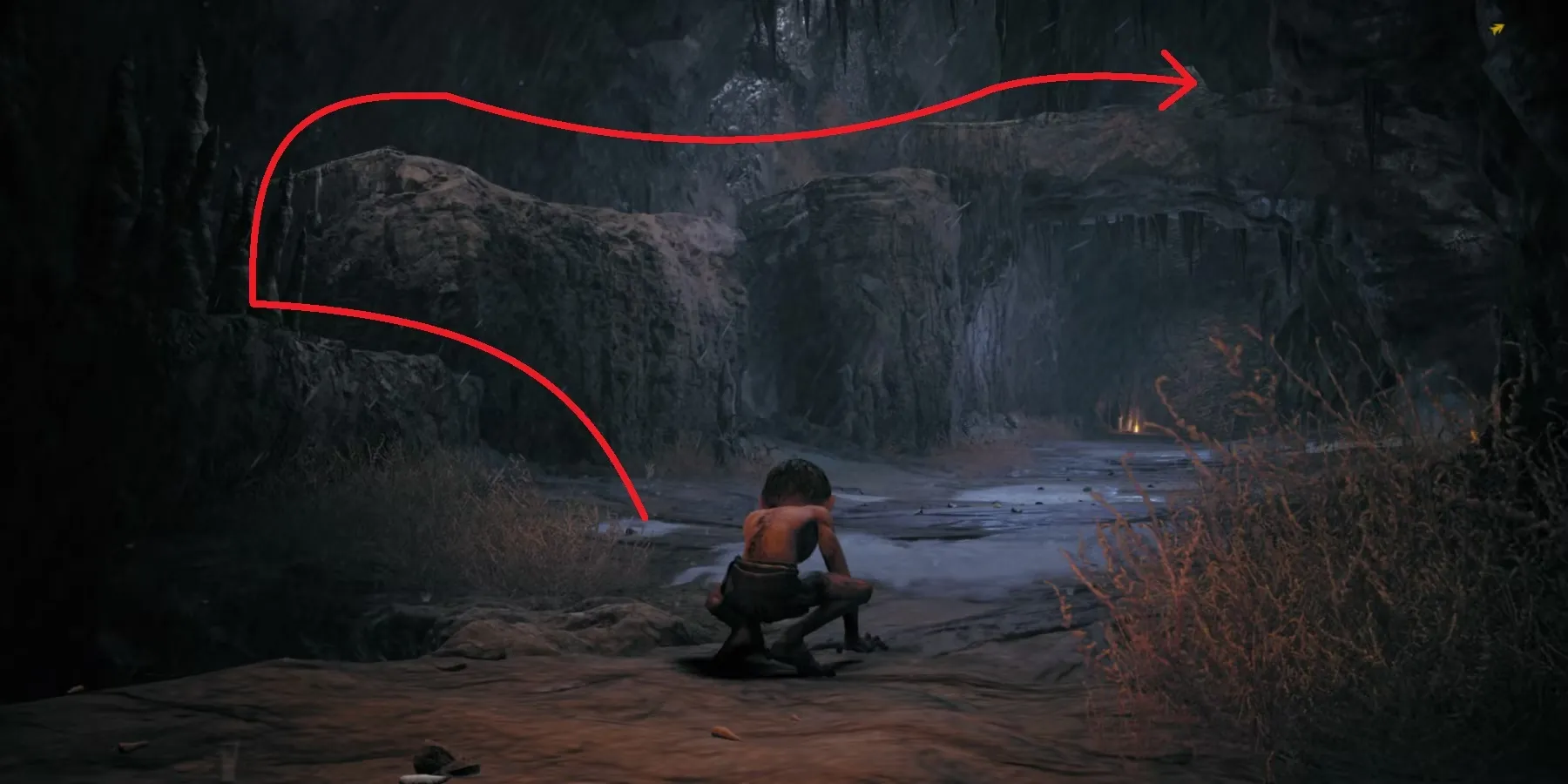 Следуя по тропинке до конца этой комнаты, вы попадете в следующую часть истории; прежде чем идти туда, игроки должны обратить внимание на выступающие каменные платформы слева. Запрыгнув на первую платформу, Голлум может повернуть направо и забраться на ту, что находится выше, где ему нужно перепрыгнуть на чуть более высокую платформу, чтобы попасть на узкий каменный проход.