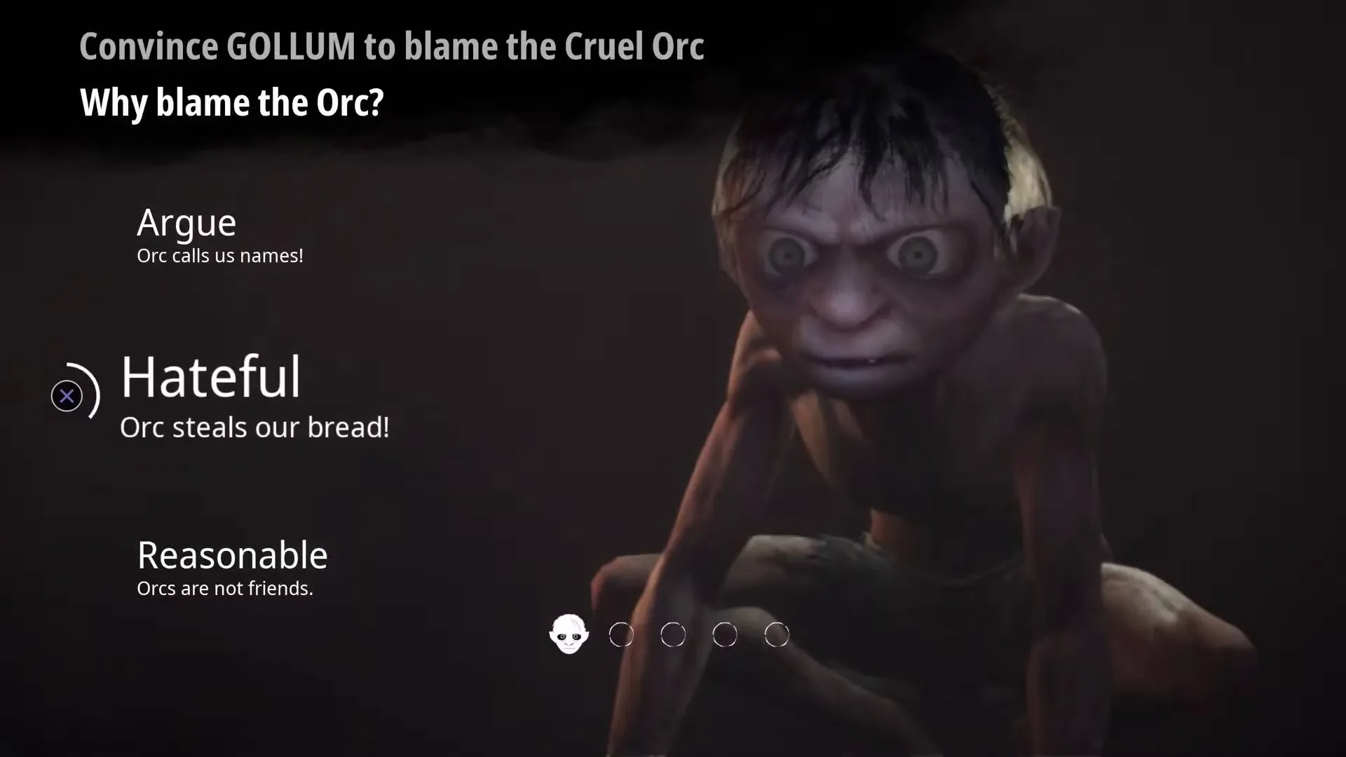 Чтобы обвинить жестокого орка, Смеагол должен убедить Голлума, что Хрупкий человек все еще полезен для них и что жестокий орк - приемлемая мишень. Этого легко добиться, напомнив Голлуму, как Жестокий Орк крадет их хлеб и как у Хмурого Человека есть связи, которые могут пригодиться для получения еды.