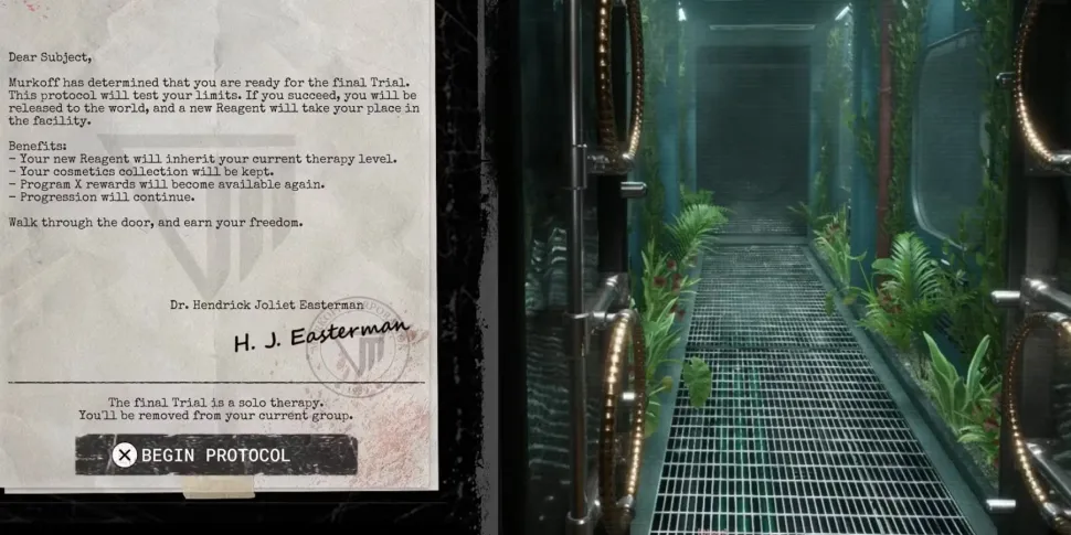 Конечно, перерождение - это не просто выход на свободу. Вместо этого игрокам предстоит пройти последнее одиночное испытание, прежде чем покинуть Murkoff. Последнее испытание проходит в том же особняке, что и вводный инструктаж, но оно гораздо сложнее, с большим количеством врагов и заданий.