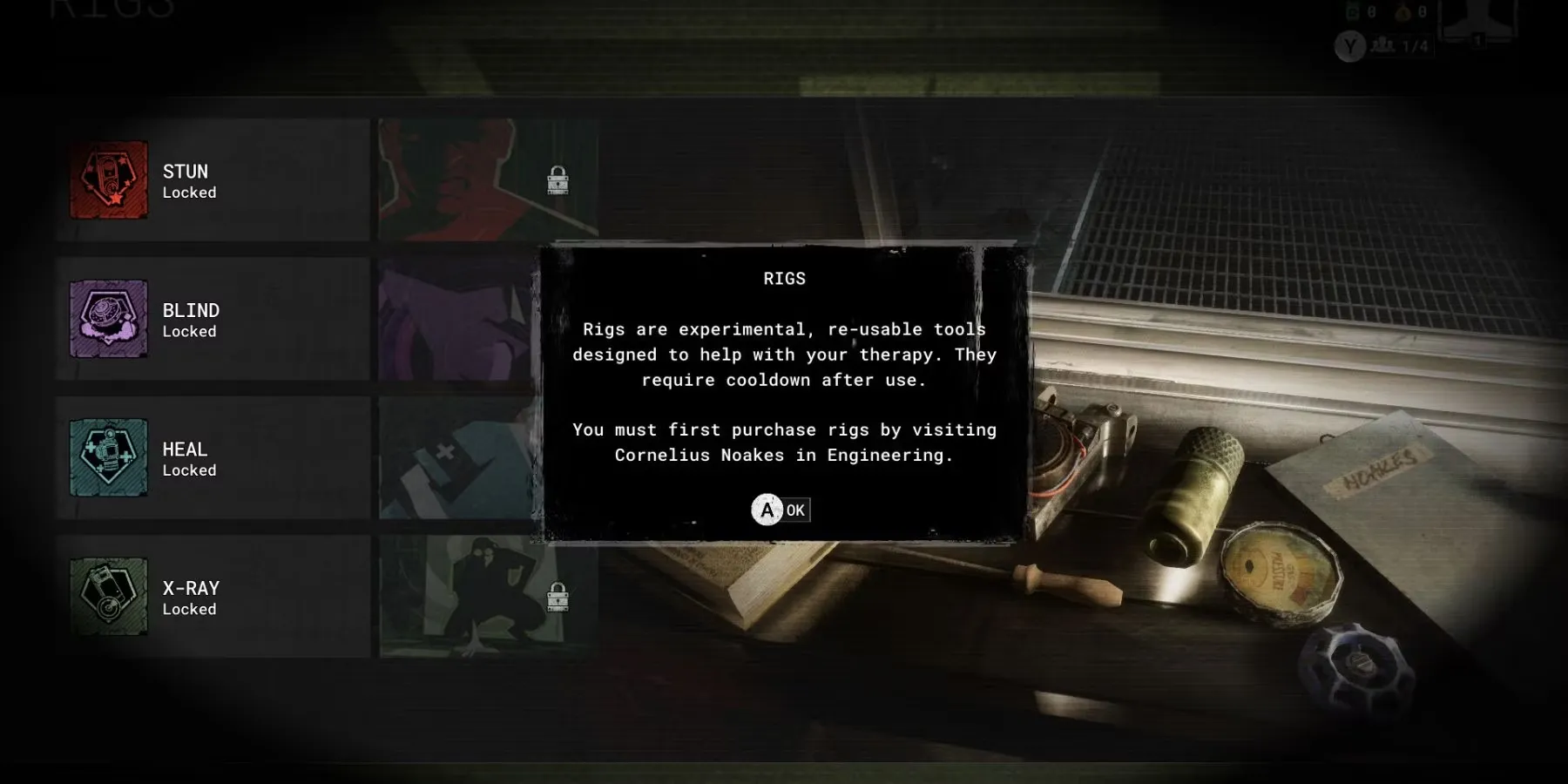 Игроки могут приобрести риги у Корнелиуса Ноакса, инженера на объекте, как только достигнут уровня терапии 2. Уровень терапии повышается по мере того, как игроки зарабатывают XP во время испытаний. Прохождение испытания дает наибольшее количество XP, но небольшие суммы можно заработать даже в случае неудачи. Например, пройдя первое испытание The Outlast Trials, "Kill the Snitch", игроки получат уровень терапии 2.