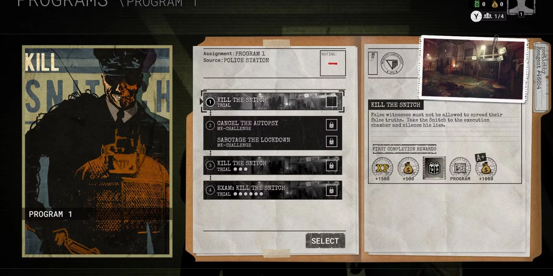 Игроки могут получить доступ к испытанию "Kill the Snitch" на главном терминале в "Комнате сна" на вкладке "Программы". В кратком описании испытания будет объяснена цель миссии: Заключенный дает "ложные показания" против учреждения Murkoff, и игрокам предстоит заставить его замолчать.
