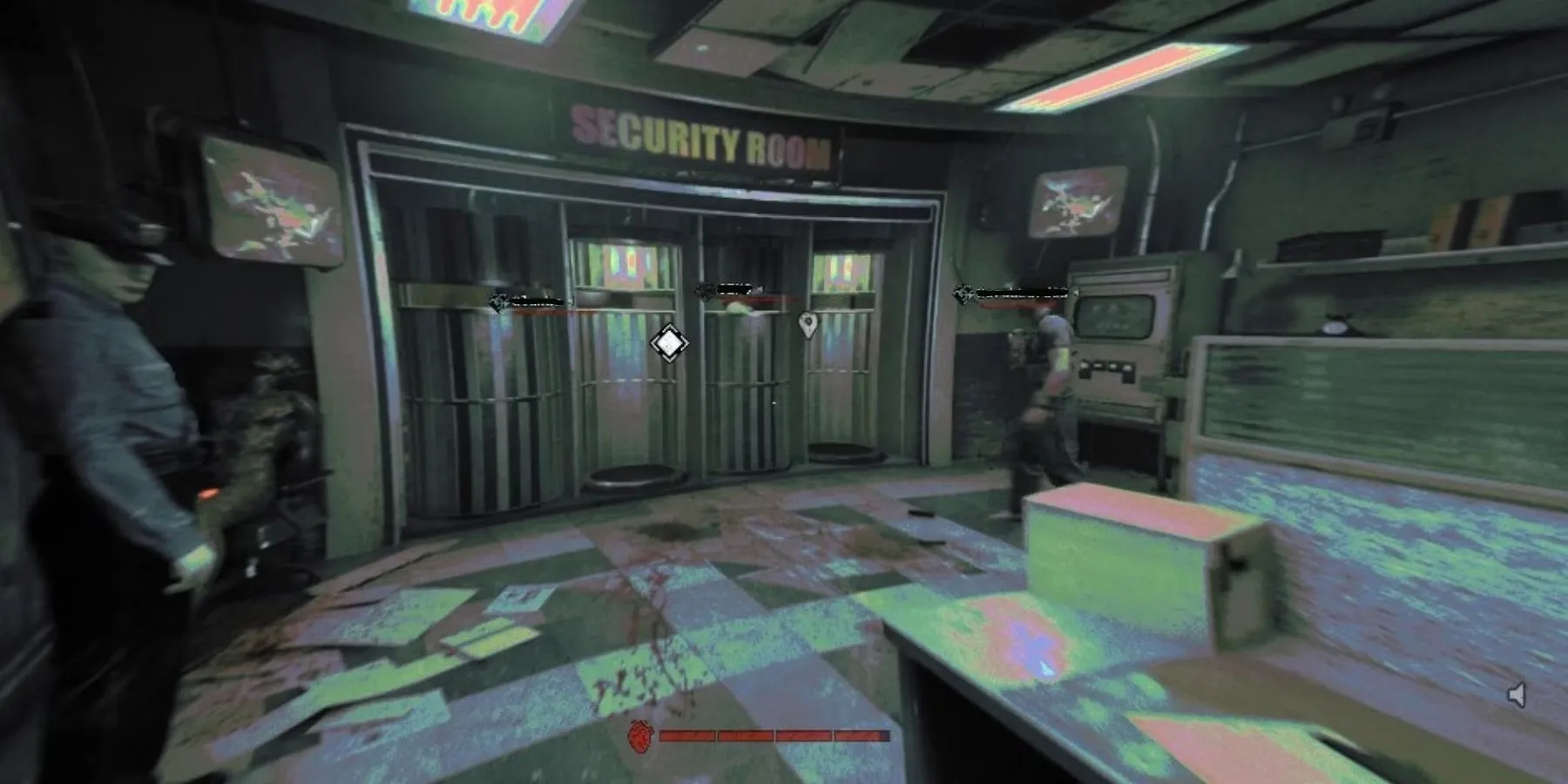 Вход в комнату безопасности похож на терминал, в который попали игроки, и они поворачивают в комнату. Вход внутрь вызывает катсцену, после чего появляется новая цель - отправиться в камеры и забрать стукача.