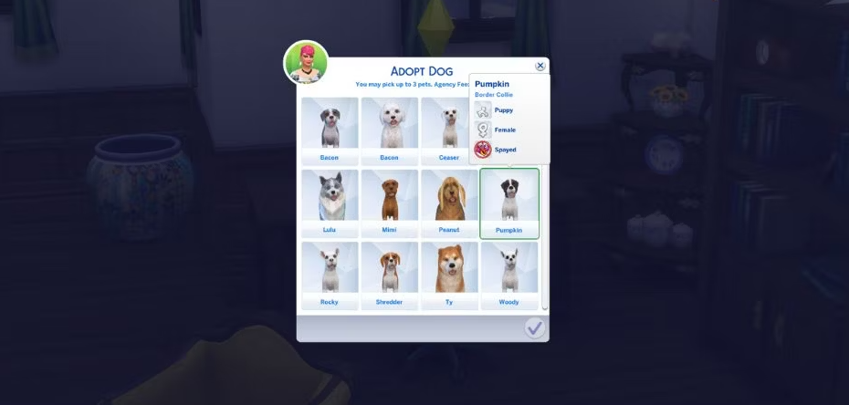 Появится меню с собаками или кошками, которые доступны в данный момент, и вы сможете выбрать до трех собак или кошек одновременно. Наведите курсор на портрет каждого животного, чтобы получить дополнительную информацию, включая имя, возраст, породу, пол, а также информацию о том, стерилизованы они или нет.