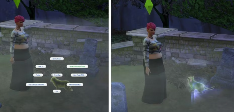 Призрачные животные появляются после полуночи в районе кладбища на острове Дедграсс, и чтобы приютить одно из них, вам нужно сначала подружиться с ним. Как и с любым другим симом или питомцем, попросите своего сима взаимодействовать с животным: играть с ним, давать ему лакомство, играть в мяч (если у вас есть мяч) и выполнять различные другие действия.