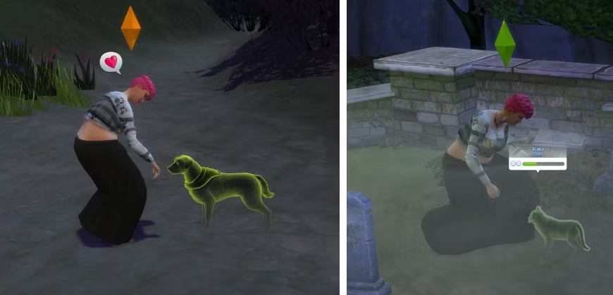 Призрачные животные появляются после полуночи в районе кладбища на острове Дедграсс, и чтобы приютить одно из них, вам нужно сначала подружиться с ним. Как и с любым другим симом или питомцем, попросите своего сима взаимодействовать с животным: играть с ним, давать ему лакомство, играть в мяч (если у вас есть мяч) и выполнять различные другие действия.