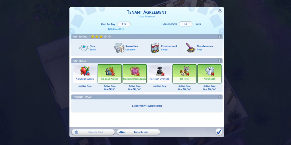 С этого экрана вы также можете путешествовать по квартире или несправедливо выселять своих жильцов. После того как вы установили все необходимые параметры, вы можете использовать значок заполнения вакансии, чтобы попытаться найти подходящего арендатора.