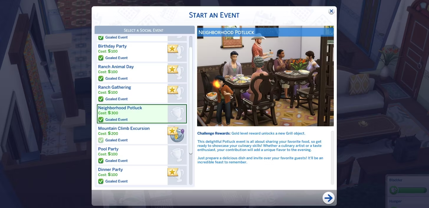 Устраивая Potluck или Pool Party, заработайте золото за это событие, чтобы не только получить специальный приз для этого конкретного типа события, но и отметить это задание как выполненное. Обязательно выполните цели мероприятия и поддерживайте хорошее настроение у гостей на протяжении всего мероприятия. Само собой разумеется, но хотя технически вы можете устроить вечеринку у бассейна даже на съемном жилом участке без бассейна, это будет не лучшая идея, если вам нужно мероприятие с золотым рейтингом. |