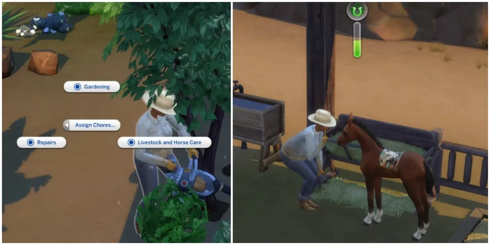 Есть три вида работ, которые автоматически назначаются, как только в дом сима заходит работник ранчо: уход за посевами, ремонт и уход за лошадьми и другим домашним скотом. Игроки могут включать и выключать эту функцию, взаимодействуя с работником ранчо и выбирая меню "Назначить работу".