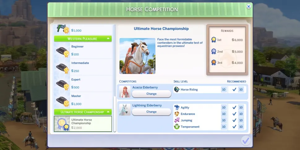Стандартные соревнования доступны каждый день с 7 утра до 7 вечера, а Чемпионат лошадей - только по субботам в эти же часы. Чтобы принять участие в соревнованиях, игроки могут либо кликнуть на Центр конного спорта в районе New Appaloosa в Chestnut Ridge, либо воспользоваться доской сообществ. Симы, которые не живут в этом районе или не хотят каждый раз перед соревнованиями ездить в соседний район, могут просто приобрести общественную доску в меню "Купить", чтобы сделать это более удобным для себя. После этого симы и лошади отправятся в кроличью нору, а игрокам нужно будет просто подождать пару часов, пока симы не вернутся с результатами.