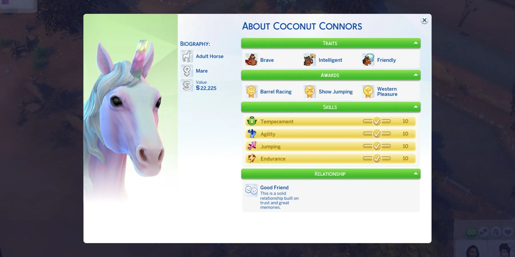 Для этого игроки могут взаимодействовать со своими лошадьми различными способами, но самый верный способ - это посадить на лошадь сима, у которого уже есть наградной признак Grand Champ Trainer, полученный при прохождении Championship Rider, так как в этом случае лошади будет присвоен настрой Confident. Важно отметить, что никаких замечаний к настроению наездника для увеличения шансов на победу в соревновании не делается.
