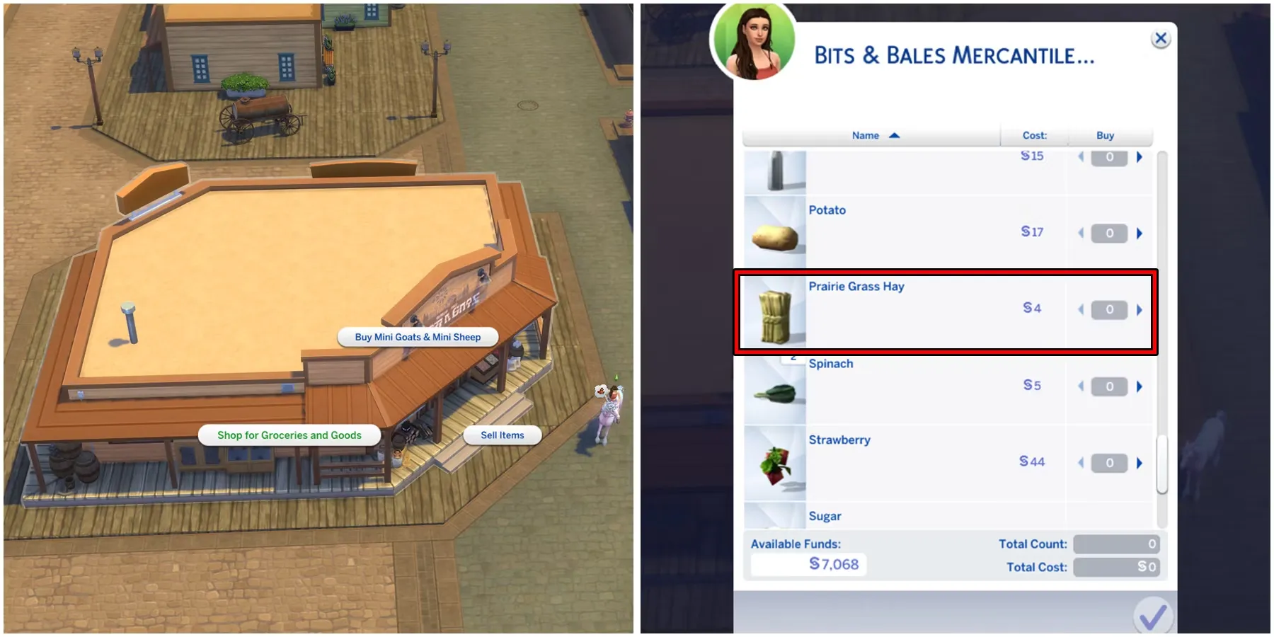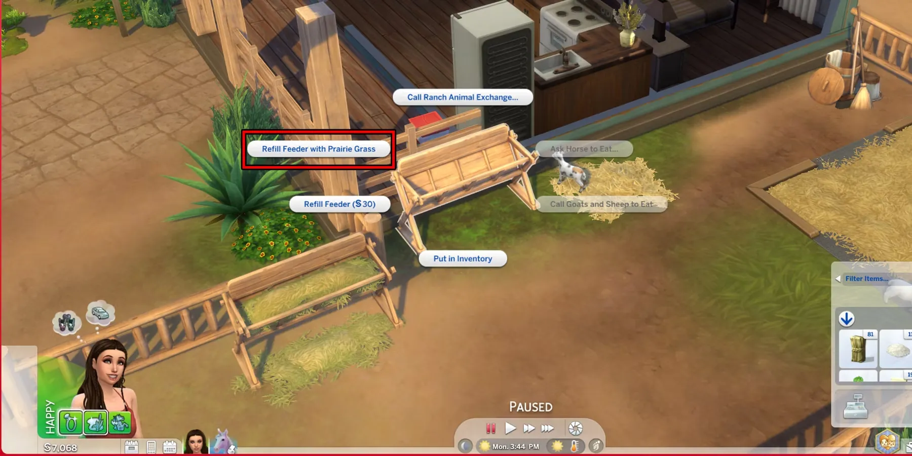Обычно, чтобы наполнить кормушку кормом, симулянты должны заплатить 30 симолеонов. Но если они соберут немного дикой травы прерии или купят несколько стопок сена прерии, то кормушка будет пополнена бесплатно. Игроки также могут щелкнуть на кормушке и выбрать пункт "Призвать коз и овец на прокорм".